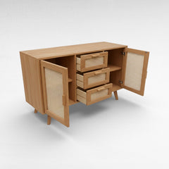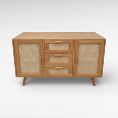 This compact yet impactful buffet (120x40x80cm) seamlessly blends solid teak wood with artisanal handwoven rattan, delivering sophisticated storage without overwhelming your space. The refined proportions make it ideal for apartments, smaller dining areas, or intimate entertaining, while maintaining the quality and presence of larger statement pieces. Teak's warm, honey-toned patina pairs beautifully with rattan's natural weave, creating visual depth and inviting tactile exploration. Built to last generations, this piece resists moisture and wear while developing character over time. Perfect for those seeking curated elegance—a buffet that proves luxury isn't measured in size, but in the integrity of materials and thoughtfulness of design.
