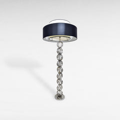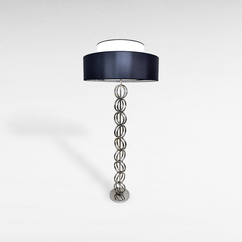 Floor lamp made of polished silver-finish metal with a sculptural, ringed structure and circular base.