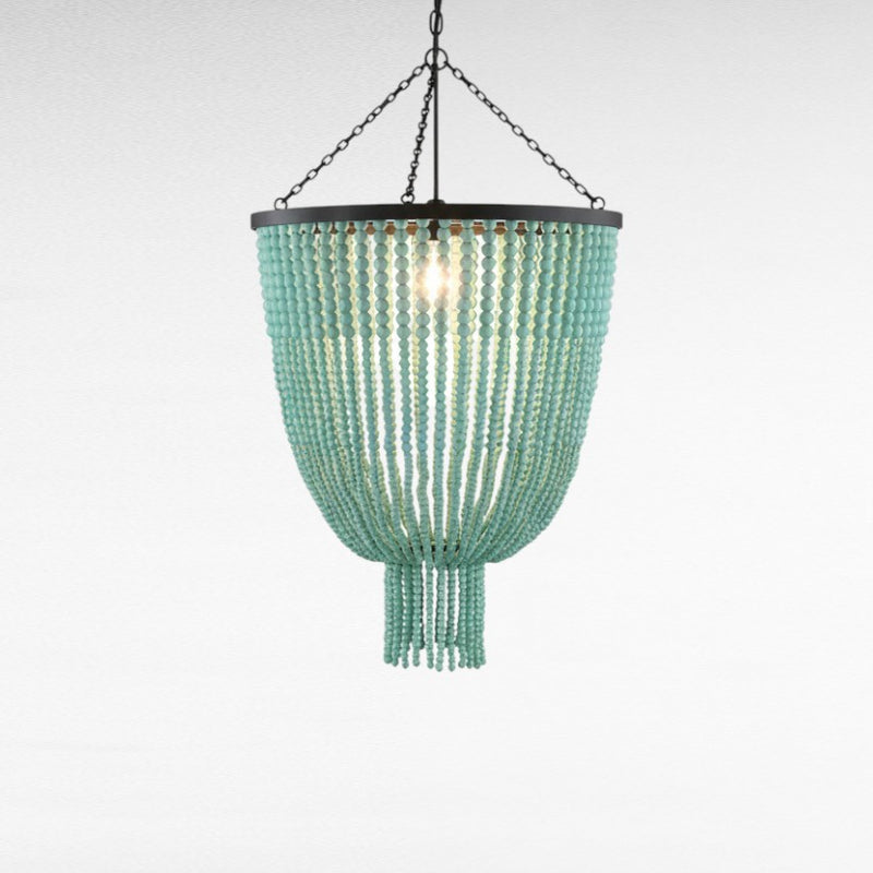 The chandelier features a tassel-like teardrop silhouette, formed by vertically cascading strands of turquoise beads. These strands descend from a circular black frame at the top and converge at the bottom into a soft, gathered point—creating a shape that’s both symmetrical and fluid.