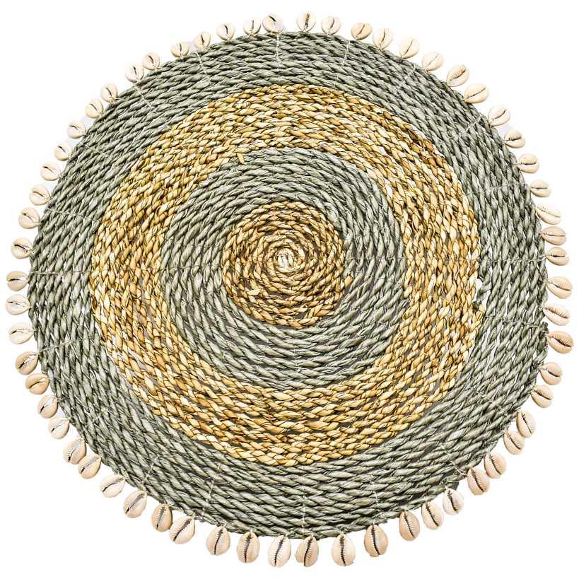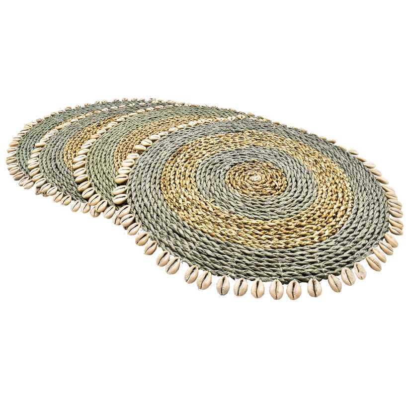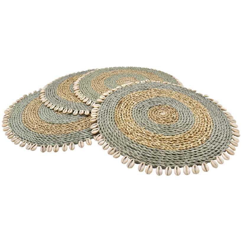 SET OF 4 TABLE MATS RATTAN & SHELLS NATURAL GREEN & WHITE 38x38cm