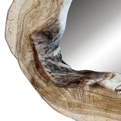 Mirror framed in thick bleached suar wood with natural curves and visible grain patterns. Its depth adds sculptural presence to the wall, combining function with visual interest.