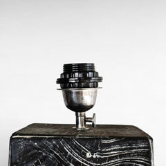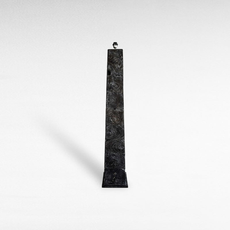 Floor lamp made of black-stained teak wood with a tall, square-cut structure and sculpted detailing.