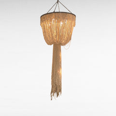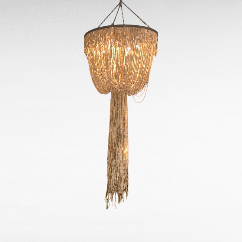 Suspended by three cords, this chandelier diffuses warm light through its cascading beadwork—ideal for vaulted ceilings, grand entryways, or boutique interiors seeking oversized impact with a refined, organic touch.