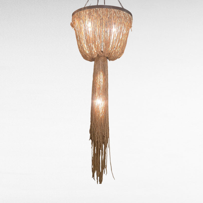 Suspended by three cords, this chandelier diffuses warm light through its cascading beadwork—ideal for vaulted ceilings, grand entryways, or boutique interiors seeking oversized impact with a refined, organic touch.